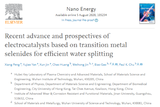 (通讯员:严宇娇)近日,我院特聘教授彭祥博士指导课题组研究生系统综述了过渡金属硒化物电解水催化剂的最新研究进展,涵盖多种过渡金属硒化物体系,重点涉及其物理性质,合成方法,催化活性分析和性能调控策略,并对该领域的发展作出总结和展望。相关成果以“Recent Advance and Prospectives of Electrocatalysts Based on Transition Metal Selenides for Efficient Water Splitting”为题发表在能源领域顶级期刊Nano Energy(IF:16.602)上,我院等离子体化学与新材料湖北省重点实验室为该论文的第一单位。