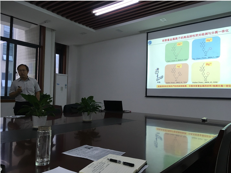 徐林博士首先对超分子化学的基本情况和研究背景进行了讲解,然后从荧光探针的基础知识引入,详细介绍了基于H2S生物信号小分子荧光探针、利用金属复合物实现组氨酸识别进行重金属污染物离子检测、配位键导向自组装和三维组装超分子等研究内容。报告最后,徐林博士详细回答了参会教师和学生的相关提问,并鼓励学生要努力学习,争取在攻读研究生期间抓住学习的机会,努力提升自己的科学研究能力。整场报告深入浅出,现场师生互动,气氛活跃,师生获益匪浅。