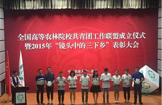 本网讯(通讯员 郑新霞)6月17日,由团中央学校部、团中央网络影视中心主办的2015年“镜头中的三下乡”暑期社会实践评选大赛表彰大会在北京中国农业大学隆重举行。团中央学校部副部长李骥出席活动并现场致辞,来自全国各地近50所高校的近百名师生参加本次会议,我校作为获奖单位受邀出席活动并现场领奖。