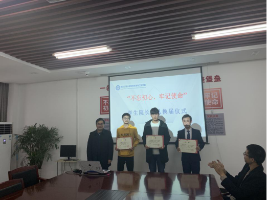 第一届“学生院长”团队负责人王嘉恺、董阳达、翁宇晨分别就过去一年团队在学院创新创业、学风教风、实验室管理等方面所做的工作及所取得的成绩做了详细汇报。