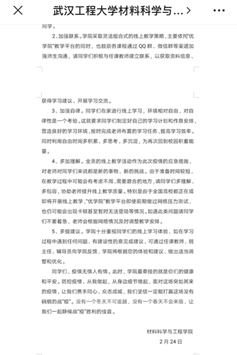 疫情发生以来,学院积极抓牢网络阵地,及时转发教育部《致全国大学生的一封信》、湖北省教育厅《致全省学生及家长的一封信》,并接连推出“疫”起承诺倡议书和“关于开展线上教学是全体同学的一封信”等,引导同学们注意日常防护和加强网络学习自律,利用QQ、微信直播开展网络主题班会,号召学生做疫情防控的“践行者”、网络谣言的“粉碎机”、线上学习的“急先锋”。