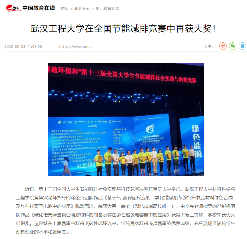 8月30日,第十三届全国大学生节能减排社会实践与科技竞赛决赛落下帷幕,我院2项作品入围决赛并分别斩获全国一等奖1项(湖北省属高校唯一)、三等奖1项,学校荣获优秀组织奖,受到广大社会媒体的广泛关注,并被《中国教育在线》报道。