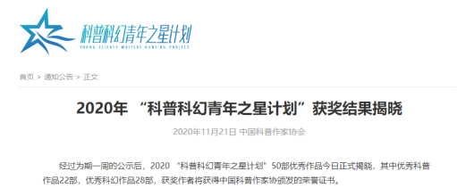 据悉,“科普科幻青年之星计划”是中国科普作家协会自2017年以来持续开展的青年科普科幻创作人才培训和扶持计划。凡入选50篇优秀作品的作者均可以享受免费高级培训和专家全程创作指导,可获得中国科普作家协会颁发的培训证书,并有机会在中国科普作家协会相关平台进行发表,包括《科普创作》《科学故事会》《科幻世界》《科学大众》《科幻立方》《民主与科学》《科普时报》以及中国少年儿童新闻出版总社的出版物、中国科普作家网、中国科普作家协会公众号等,有机会参加“中国科普作家协会优秀科普作品奖”评选,有机会参加中国科普作家协会2020年会并申请加入中国科普作家协会及地方科普作家协会。