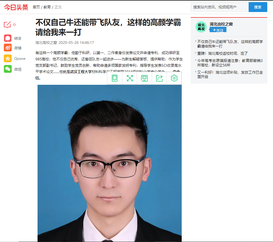 有这样一个高颜学霸:他勤于科研,以第一、二作者身份发表论文并申请专利,成功保研至985高校;他不仅自己优秀,还督促队友一起进步——为新生解疑答惑、提供帮助;作为学生党支部副书记,鼓励学生党员创新,帮助申请多项国家发明专利;指导学生发表SCI收录高水平学术论文……他就是bevictor伟德官网材料科学与工程学院2016级材料化学专业学生——孛金钰。