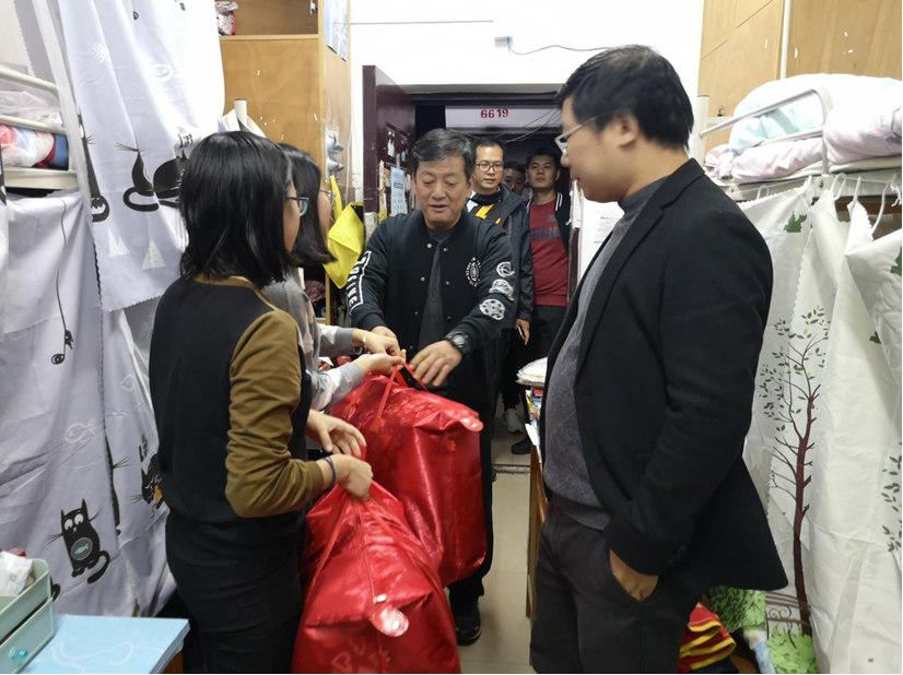 学院领导和老师一行先后走访巡查教辅6栋、7栋、8栋学院学生宿舍,查看宿舍设施是否存在安全隐患,重点对宿舍用水、用电、卫生、安全等情况进行了巡查和现场指导。学院领导一行查看和慰问了部分家庭经济困难学生的学习和生活情况,并为家庭经济困难学生送上爱心棉被。领导们与同学们亲切交流并嘱咐同学们要和睦相处、相互帮助,养成良好的生活习惯,积极营造健康的宿舍文化;要合理规划好大学生活,积极参与各类集体活动,关心关注学院发展。整个走访过程,热情的话语,亲切的问候,处处充满了关怀和温暖。