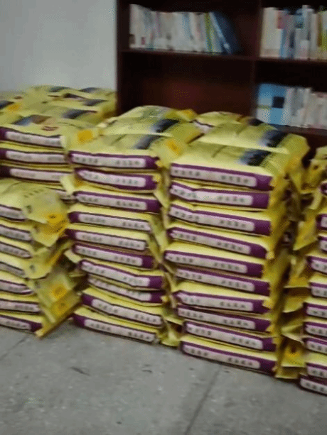 在进行简单的交接后,便是繁重的卸货过程,本批物资共有257袋米和267桶油,工作量巨大,但志愿者们不惧困难和劳累,合理运用劳动人民的智慧,与村干部一起用人工接力的方式有条不紊从车上开始卸物资。