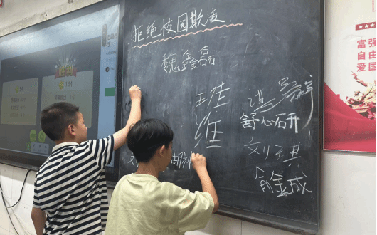 志愿团成员陈乾坤向同学们进行题为“反对校园霸凌、守护校园安全”的授课,他充分考虑到孩子们的年龄特点及认知发展需求,围绕“什么是校园欺凌、校园霸凌的主要表现形态、校园霸凌的应对举措”等方面,从校园欺凌的身体欺凌、语言欺凌、网络欺凌、社交欺凌四个种类入手,深入浅出地讲解校园欺凌带来的危害及影响,并向孩子们“支招”:一是与同学友好相处,二是财不外露,三是不以暴制暴,四是不沉默,五是学会维权。学生们纷纷表示,今天的法治课堂让自己懂得了什么是校园霸凌,如何保护自己,以后要更加注意自己的言行,也会勇敢地对霸凌说“不!”。