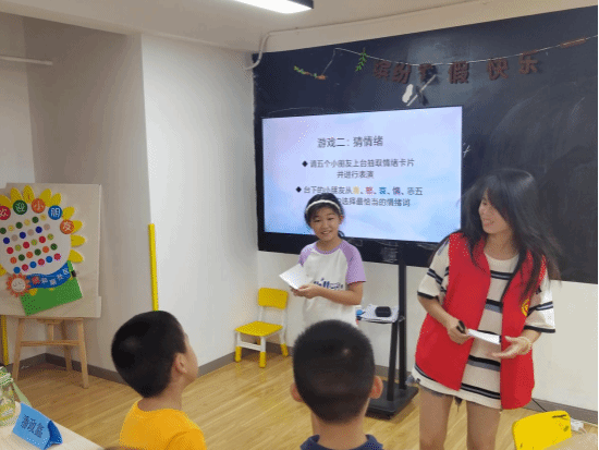 最后,部分小朋友在志愿者的邀请下上台表演不同情绪,让其他小朋友来猜。孩子们积极配合,表演了喜、怒、哀、惧、怒等多种情绪,在寓教于乐的教学模式里,孩子们广泛参与、积极探索,上好人生成长里重要的一课。潘雅心小朋友说到:“谢谢老师教会我这些,我会一直努力的,争取每天都做情绪的主人。”“能够作为主讲人,向孩子们传授心理健康相关知识,让我感到无比的开心志愿者夏慧颖说道。