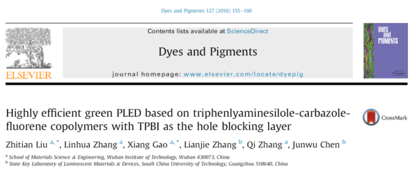 此外刘治田教授课题组在防火涂料、电致发光聚合物材料以及储能材料等方向也取得了丰硕成果,多次发表在SCI二区及以上期刊上,如Physical Chemistry Chemical Physics(IF:4.123),Dyes and Pigments(IF:3.473),Organic Electronics(IF:3.399),Progress in Organic Coatings(IF:2.858),Polymer Chemistry(IF:5.375)和Polymers(IF:3.364)等。