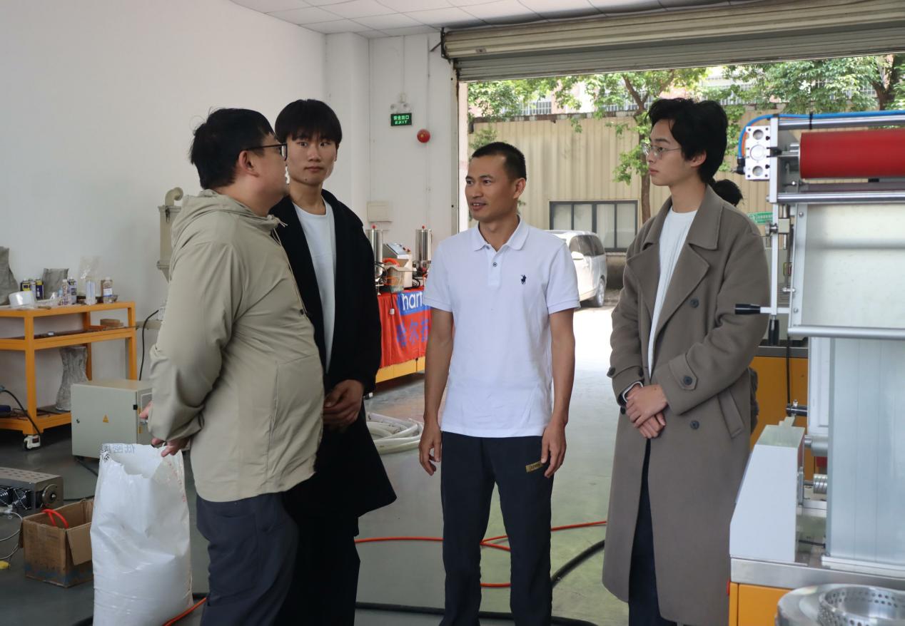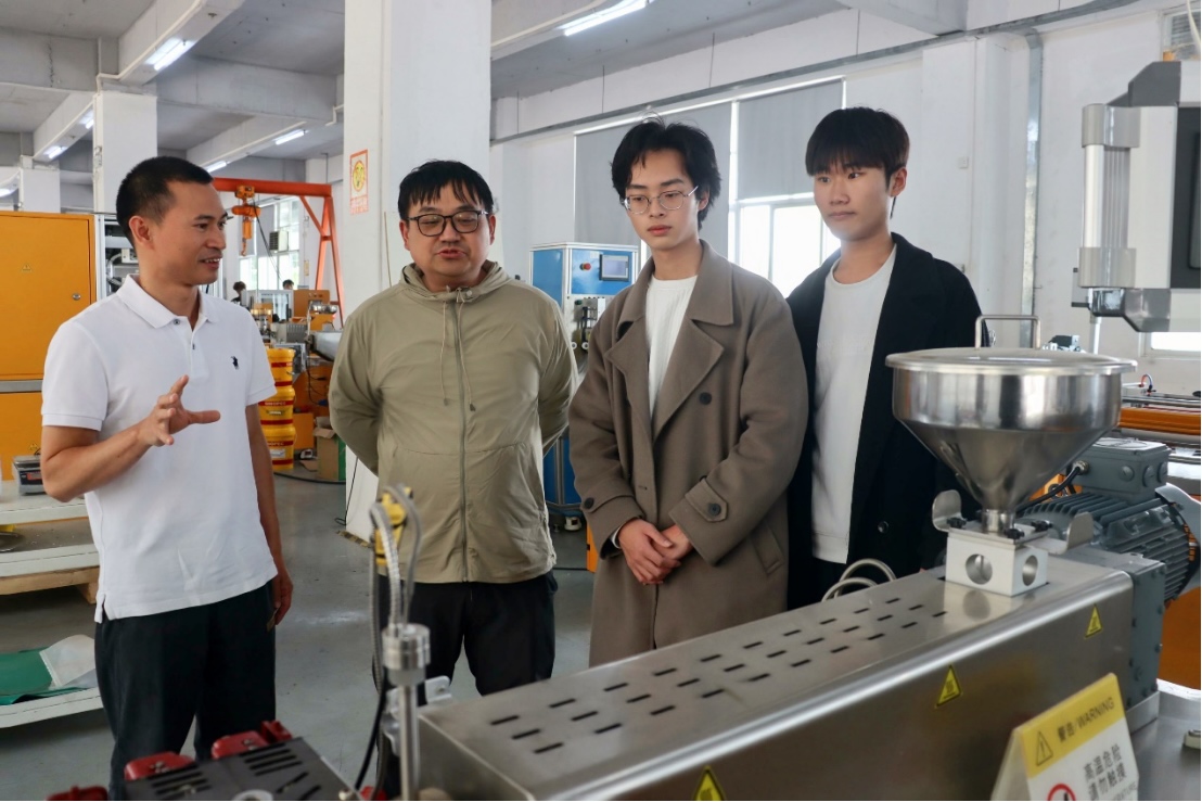 实践团首站探访了国家专精特新“小巨人”企业——广州市哈尔技术有限公司。作为深耕高分子材料绿色循环领域的标杆企业,哈尔技术凭借其核心技术,构建了从设备研发到工艺优化的全链条解决方案,以科技赋予废弃材料“重生”的新生力量。在企业工程师的引领下,材料学子们深入生产一线,近距离探秘双螺旋挤出与催化降解两大核心设备的“硬核科技逻辑”。当工程师在催化降解装置前演示废弃材料的循环转化过程,并讲述反应装置背后多年的研发坚守时,其袖口沾染的污渍,成为科研人执着追求的生动写照。