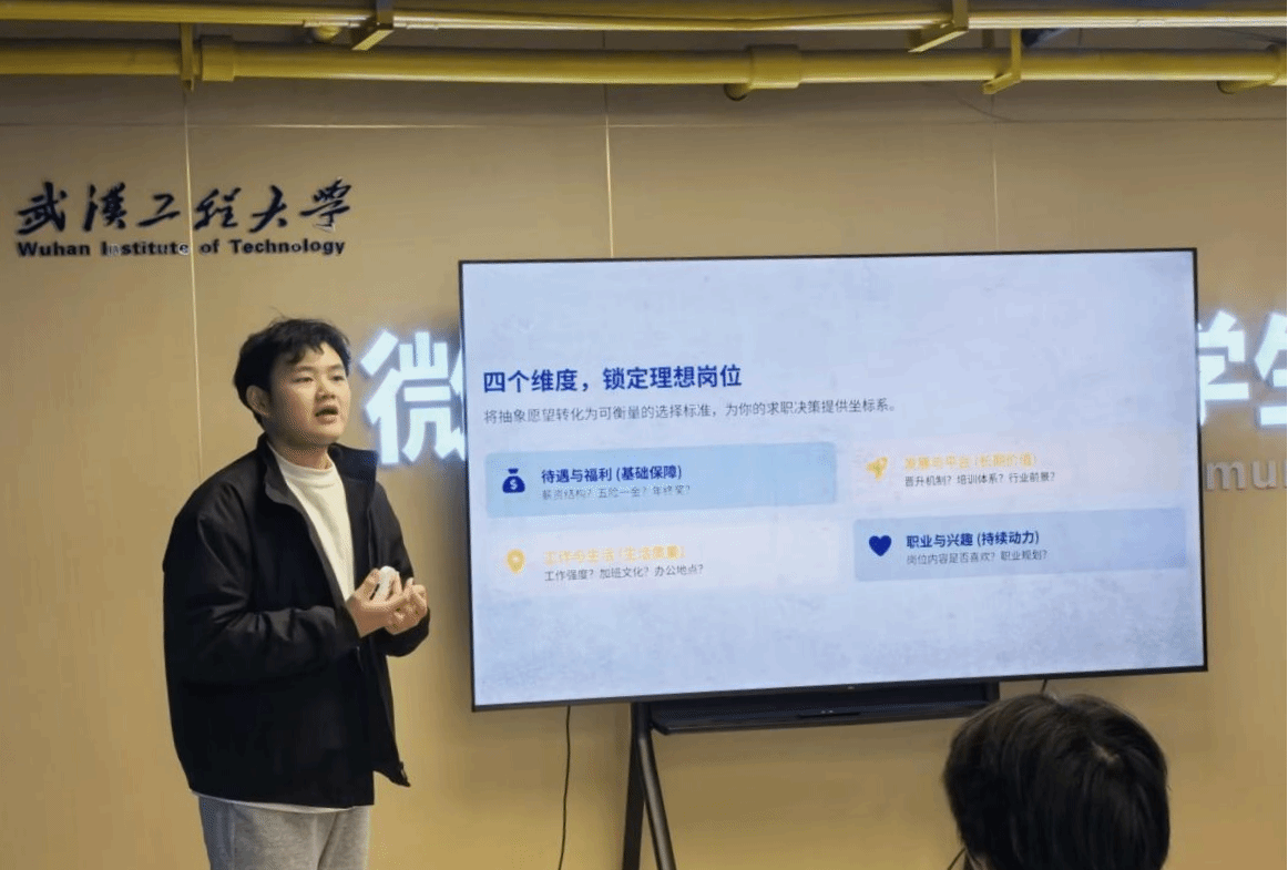 随后,刘洋借提问“未来薪资预期”引出“个人选择决定职业航向”的观点。他从待遇福利、发展平台、工作生活平衡、职业兴趣匹配度等维度阐述岗位选择标准,分享高效求职渠道以打破信息不对称,还补充简历撰写与面试自我介绍要点,为同学提供指导。此外,他提醒大家求职要做好“持久战”准备,针对简历投递无回音等问题给出应对策略。最后,他总结“将方法内化为习惯,方能从‘偶然获得 offer’转变为‘必然获得 offer’”,引发全场共鸣。