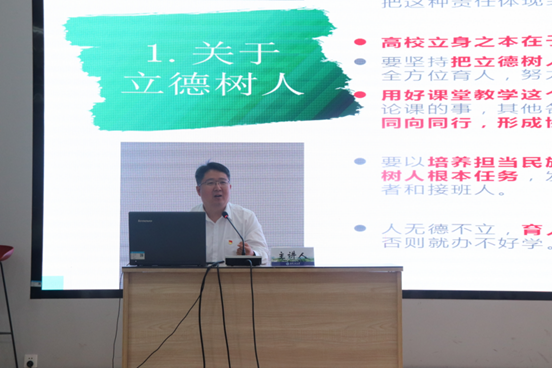 材料科学与工程学院党委书记王涛以《立德树人铸师魂不忘初心正师风》为题进行了专题报告,他从深刻领会习近平总书记关于新时代师德师风建设重要论述的深刻内涵、深入推进习近平总书记关于新时代师德师风建设重要论述的贯彻实施两个方面,全面系统地阐释了十八大以来习近平总书记关于师德师风的重要讲话,并勉励大家牢记立德树人根本任务与为党育人、为国育才的使命,做新时代有理想信念、有道德情操、有扎实学识、有仁爱之心的“四有”好老师。