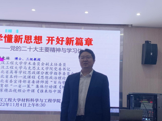 舒先林以《学懂新思想开好新篇章》为题,从党的二十大及报告的战略意义、党的二十大报告框架结构及关键词、报告中的新观点新论断新思想三个方面全面解读党的二十大主要精神并分享学习体会。他强调党的二十大是关键时刻召开的一次十分重要的大会、事关党和国家前途命运和民族伟大复兴的大会、充分彰显中国共产党成熟与自信的大会,并从七个方面总结党的二十大报告的重要地位。重点围绕前言、以15个大标题展示的报告主体部分、结束语三大板块解读报告内容,运用关键词词频、词云图、科学思维与关键词表述等方式生动形象地突出报告要点。对照十九大报告内容,总结了25个党的二十大报告中的新观点新论断新思想。