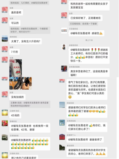 考虑到有学生没有带厚衣服,担心学生受冻受寒,学院党委副书记张琼先来到校门口的服饰店,确定有合适厚度、样式的衣服后,和辅导员田明华专车接送学生到店挑选,学生们精心挑选、试穿,都买到了心仪的冬衣。张茜、热孜、李昊昱还帮有需要的学生选购了棉被、棉鞋。家长们对学院暖心的举动非常感动,表示将学生交给学校很放心,不仅是学生感受到了家的温暖,家长们更是看到了老师们的付出。