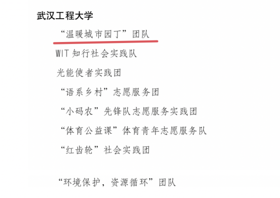 (通讯员 热孜瓦古力)近日,在2022年湖北省大中专学生志愿者暑期文化科技卫生“三下乡”社会实践活动中,经基层申报、各地各单位团组织推荐、线上宣传展示、组织评议等环节,材料科学与工程学院“温暖城市园丁”社会实践队荣获省级“优秀团队”称号,学院学生团委副书记、团队负责人张茜荣获“先进个人”荣誉称号。