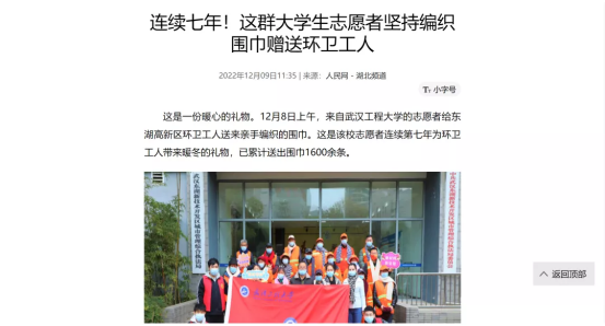 七年来,“温暖都市园丁”活动受到人民日报、湖北日报、长江日报、新浪新闻、极目新闻、东湖高新区城管公众号、掌上武汉、汉新闻等多家媒体宣传报道,发挥了良好的示范作用,有效提高了学校学院的美誉度。