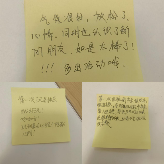 将悬疑推理与社交互动结合的剧本杀,深受年轻人的喜爱,在如是心理协会的带领下,8名同学在欢乐剧本杀中体验角色精彩各异的人生。本不认识的同学们在不断的聊天、交流、博弈中越来越熟悉,剧情也在共同推理演绎下逐渐明晰。剧本杀给同学们提供了情绪宣泄的出口,参与同学们的感受高频词是“放松”、“开心”、“交友”。