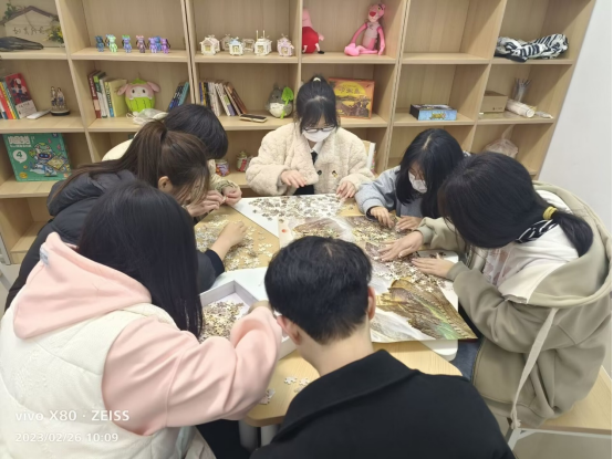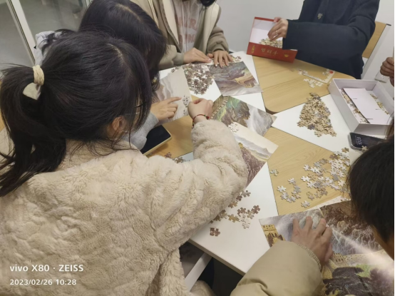 拼图能够激发推理思考能力、增进手眼协调能力,培养耐心、专注力,完成之后还能获得成就感。如是心理协会成员引导同学们放下纷杂思绪,沉浸拼图。活动中同学们互帮互助、合理分工、配合默契,共同拼出了万里长城和学校建筑,在这个过程中,同学们增强了对国家、对学校的认同感,也拆掉了忧虑,浸心拼出自己的成就和放松惬意。