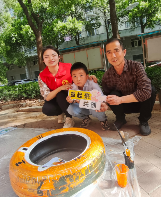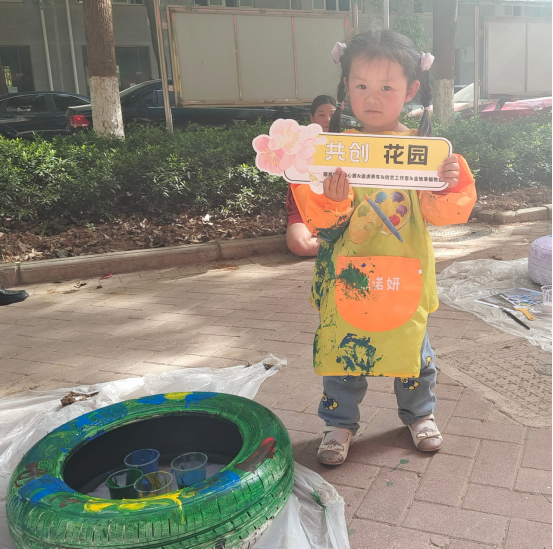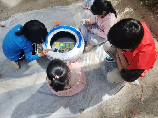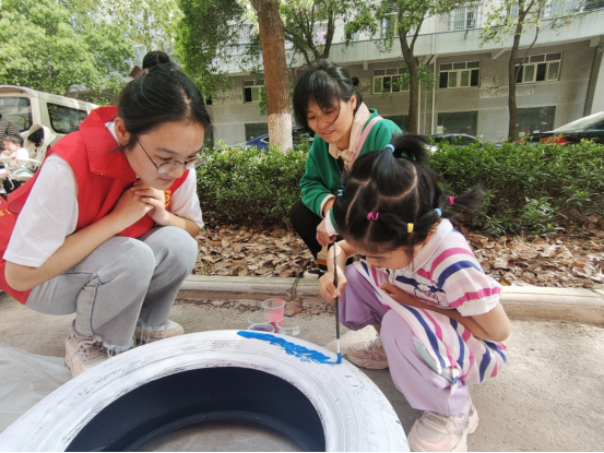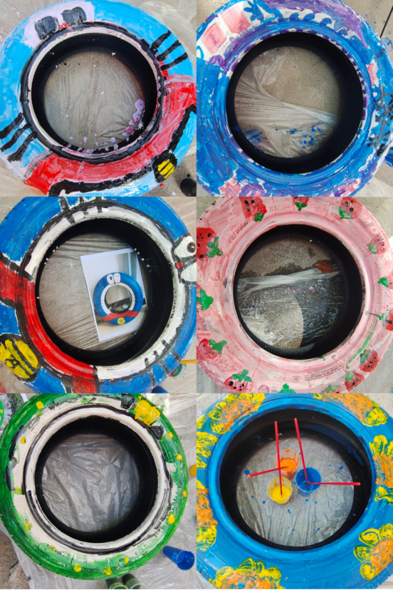 在志愿者们带领下,小朋友们以废旧的轮胎为画板,兴致勃勃地涂鸦、涂色,有的画了可爱的小动物,有的画了美丽的风景,还有的小朋友画了自己的家庭和朋友。同时,志愿者们细心扶住轮胎,方便孩子们绘画,及时递上画笔,并且耐心指导,引导他们发挥无限的想象力,在废旧的轮台上进行创作。