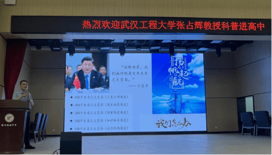 张占辉首先带领晴川高中的高二学子们观看了“最美大学生”刘耀东的颁奖视频、材料科学与工程学院宣传片,展示了我院人才培养成果和学院的优势和特色。随后,他以《新时代、新材料、新未来》为主题,为同学们作了一场别开生面的讲座。张教授从新时代背景下的新材料出发,结合党的二十大报告、材料的产业链地位向同学们表示,目前国家对德智体美劳全面发展、工程实践能力和创新创业能力突出的材料类专业高素质工程人才有迫切需求。随后他向同学们展示了面向未来的材料类专业并列举了遭到西方国家卡脖子的技术领域清单,鼓励同学们要为国家战略贡献力量,要向世界展示大国硬核实力。整场讲座内容丰富,集科学性、知识性和趣味性于一体,激发了晴川高中同学们的科学学习兴趣和动力。