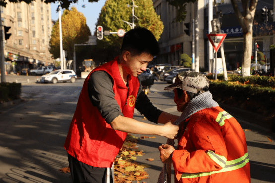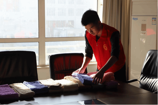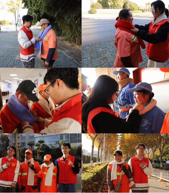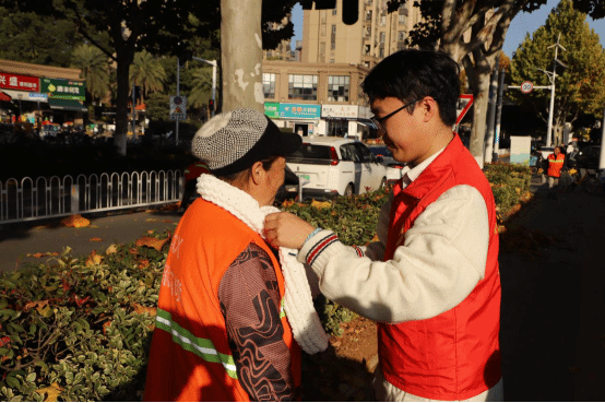 “小蓝钻”们纷纷走上街头,为正在仔细清扫道路的环卫工人们,亲手为他们戴上志愿者编织的围巾围巾,亲切地问候:“感谢您为城市环境做出的贡献,一定要注意身体”。洒满落叶的街道,柔和的阳光撒下一片光晕,城市园丁们微微上扬的嘴角、折叠的眼角皱纹更显动人,在场看到的志愿者也不由得会心一笑,历经两个多月的辛勤付出似乎在此刻画上圆满的句号。