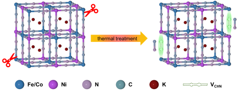 电解水制氢过程中阳极析氧反应是制约整体反应动力学的决速步骤,降低阳极析氧反应的势垒是实现低能耗制氢的关键。研究团队通过共沉淀法和一步热处理法在普鲁士蓝中引入了C≡N缺陷位点。通过调节热处理过程,精确地调节的C≡N缺陷位点的含量,从而调控了活性位点的化学态,该催化剂在阳极析氧反应表现出了极高的催化活性和稳定性。该研究结果以《C≡N vacancy engineering of Prussian blue analogs for the advanced oxygen evolution reaction》为题,发表在国际知名期刊Journal of Environmental Chemical Engineering上,影响因子为7.7。2020级硕士生邓文浩为论文第一作者,彭祥博士为唯一通讯作者。