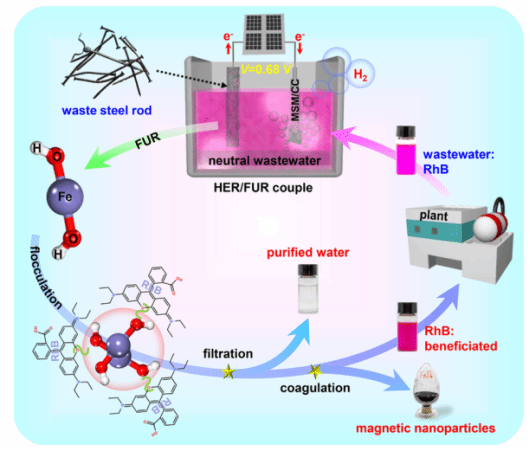 受到铁制品易氧化的生活常识的启发,研究团队提出了一种新的思路,将析氢反应与废铁升级氧化反应耦联起来,以实现超低能耗的电解水制氢。这种电解水制氢方案在槽电压和能耗方面均突破了常规电解水制氢系统的理论极限,为实现超低能耗电解水制氢提供了新途径。研究结果以题为《Ultralow-voltage hydrogen production and simultaneous Rhodamine B beneficiation in neutral wastewater》的论文发表在国际知名期刊Journal of Energy Chemistry上。该期刊是中国科学系列一区TOP期刊,入选了中国科技期刊卓越行动计划“重点期刊”项目,影响因子为13.1,彭祥博士为论文第一作者,2020级硕士生谢松(现为2023级博士生)为第二作者。