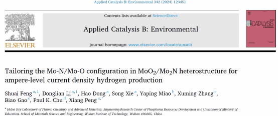 针对工业化大电流电解水制氢系统存在的问题,研究团队提出了一种新的活性位点调节策略。通过精确调控活性位点处原子的配位环境及电子构型,成功实现了在析氢反应过程中产生安培级电流密度,并能够长时间稳定运行。理论计算结果表明,这种复合结构加速了氢气从活性位点释放的过程,证实了其适用于大电流制氢的特性。这一研究成果将有效推动高性价比的工业级制氢电催化剂的开发。研究结果以题为《Tailoring the Mo-N/Mo-O configuration in MoO2/Mo2N heterostructure for ampere-level current density hydrogen production》的论文发表在Applied Catalysis B: Environmental期刊上。该期刊为催化领域一区TOP期刊,影响因子为22.1,我校等离子体化学与新材料湖北省重点实验室和磷资源开发利用教育部工程研究中心为论文第一单位,2021级硕士生冯帅为论文的第一作者,彭祥博士为唯一通讯作者。
