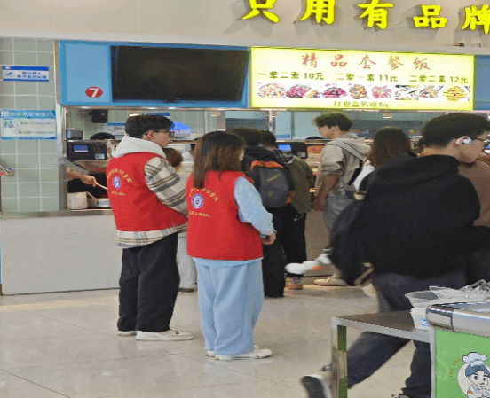 食堂门口、打菜窗口、就餐座位旁、垃圾回收处,都能看到“小蓝钻”们身穿红色马甲服务的身影。他们秉承“全心全意为同学服务”的宗旨,引导同学们有序排队打饭、自觉收拾餐具,并帮助工作人员,清理餐桌,保持食堂环境的整洁,尽心尽力维护食堂就餐秩序,引领文明就餐新时尚。