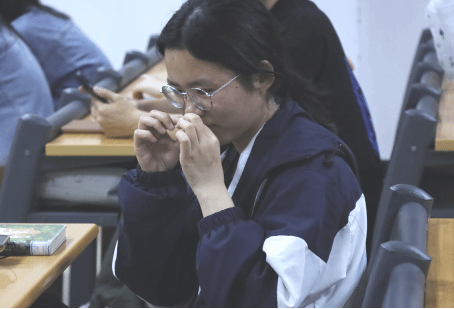 同学们了解基础知识后,晏智邀请感兴趣的同学上台进行茶艺展示,“茶艺中蕴含了古韵美、色彩美、汤色美等美之相,大家可以好好感受一下。”在温和的讲解、典雅的音乐配合下,淡淡的茶香逐渐充满了整间教室,同学们不由自主走上讲台共同参与到品茗中来。