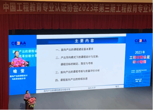 本次研讨培训由中国工程教育专业认证协会举办,会议内容包括卓越工程人才培养的新形势与新要求、工程教育认证与专业建设、面向产出的课程大纲制定和课程目标评价以及专业建设和课程建设经验分享等。开幕式上,协会秘书长周爱军作题为《面向新时代,培养卓越工程人才》的报告,重申工程认证的方向和目的,强调了培养标准与时俱进的重要性,鼓励参会学校以认证促教学,为国家培养优秀的工程师人才。汕头大学专家喻莹以《面向产出的课程设计与改革经验分享》为题,详细介绍了授课教师应该从何处入手理解认证要求,如何将认证要求切实地转化为更高层次对课程逻辑、课程内容和课程设计的构建。