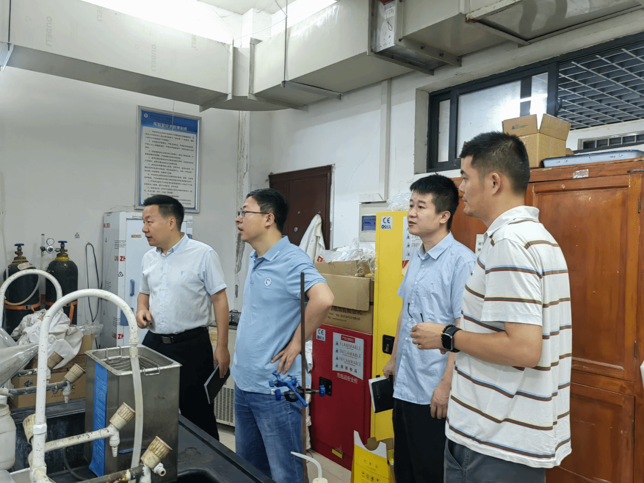 (通讯员 张义强)6月10日上午,材料科学与工程学院深入实验室开展全面安全卫生检查。本次检查由副院长熊礼威带队,实验中心主任姚楚、副主任高建宏、实验教师刘玉兰、张义强参与检查。